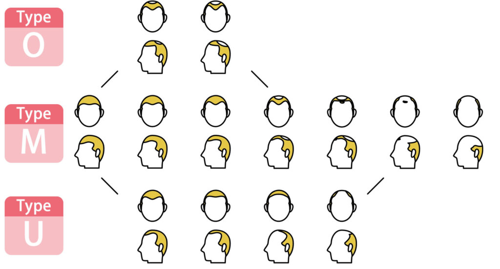 主に前頭部の生え際や頭頂部から、抜け毛や薄毛が進行していくのが特徴です。