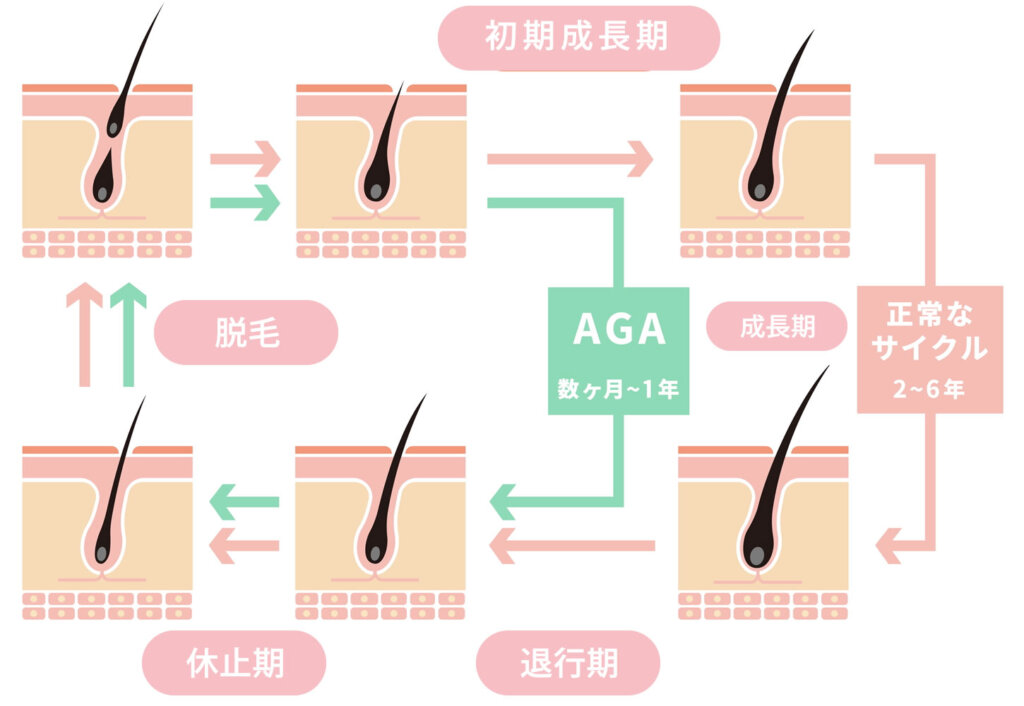 AGAは、男性ホルモンの影響により、毛髪の成長サイクルが短縮され、徐々に毛髪が細く短くなり、最終的には脱毛に至る進行性の疾患です。