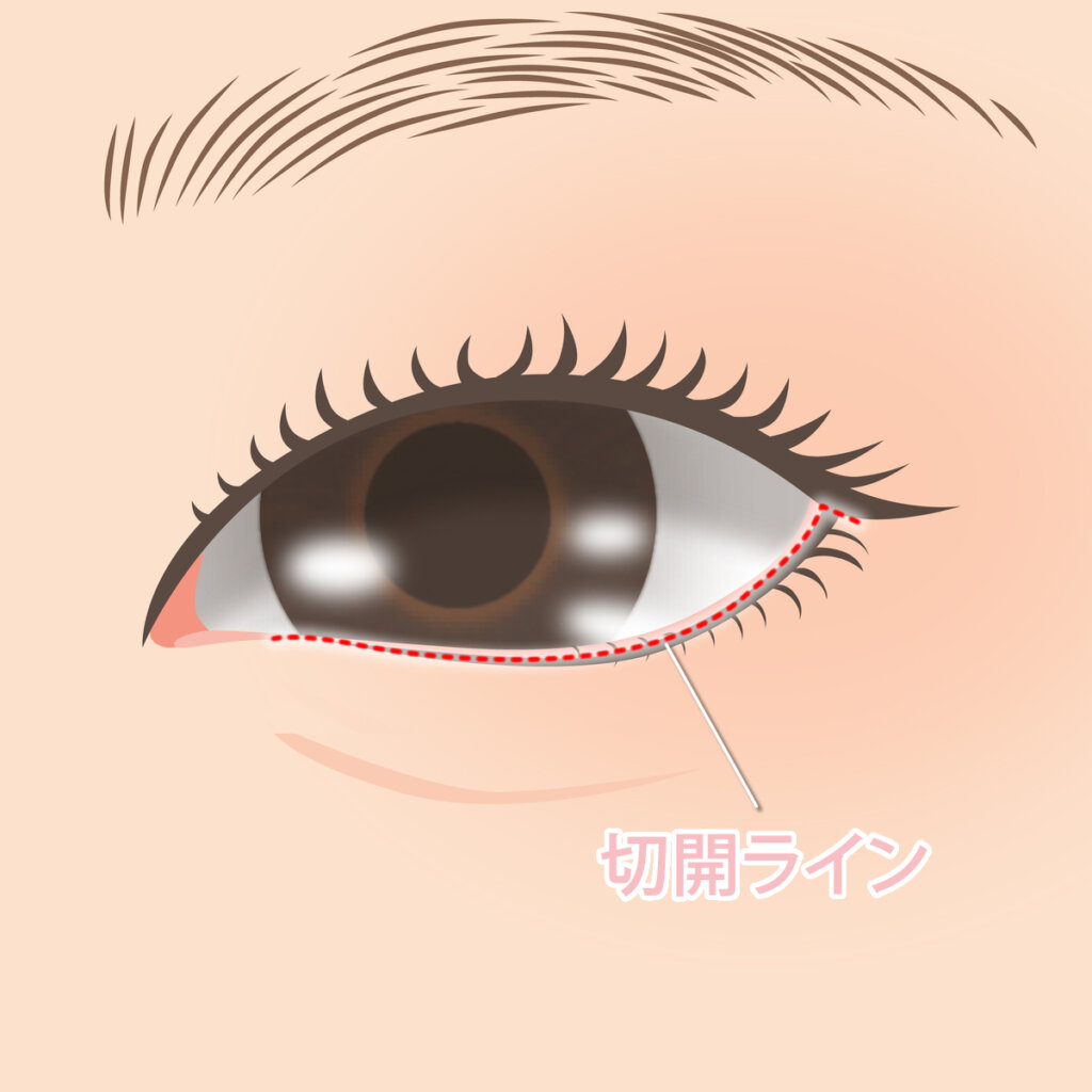下眼瞼皮膚切除では、下まつ毛の生え際から数ミリ下の位置で切開を行い、余分な皮膚を適切に切除します。
