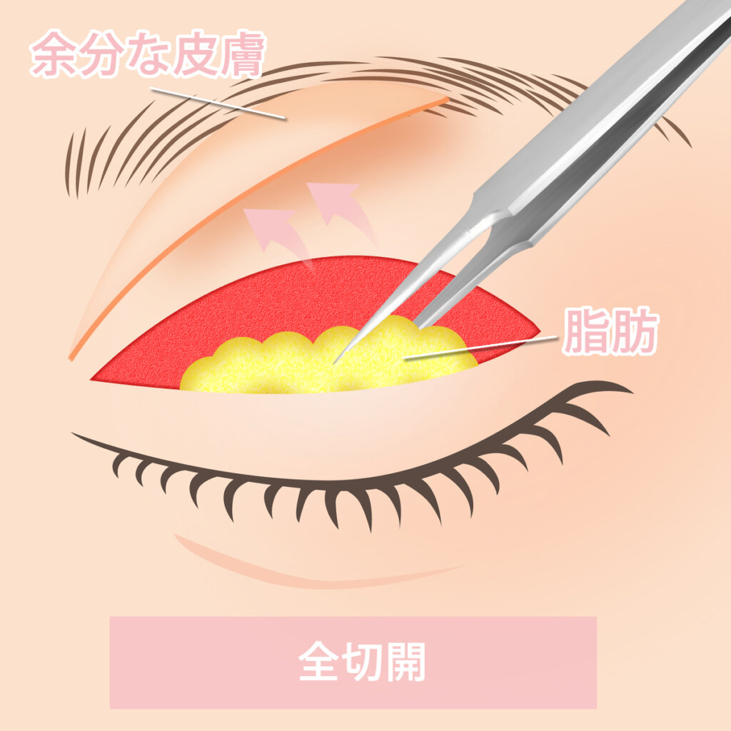全切開は、まぶたの皮膚を切開し、余分な皮膚や脂肪などを除去しながら、二重ラインを形成する二重整形術です。