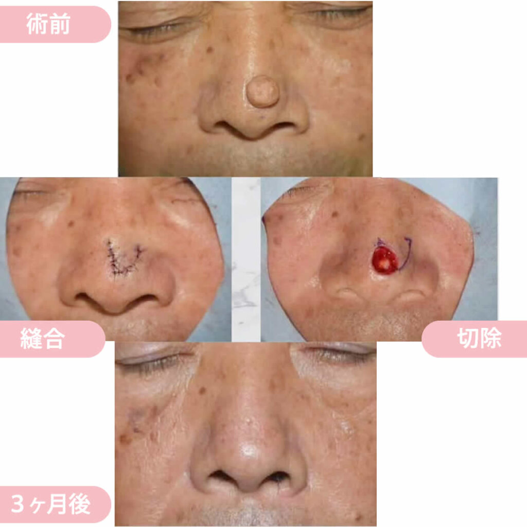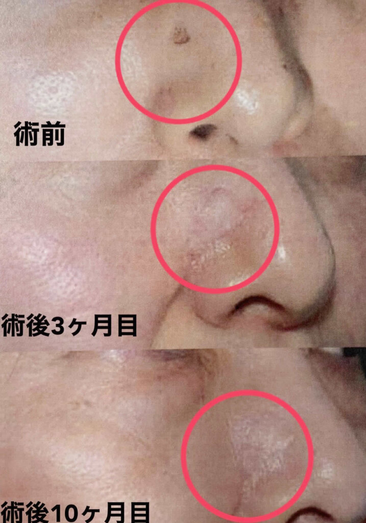 この症例は少し大きめの鼻先のホクロ除去の症例です。丁寧に縫合しているので、傷跡もほぼわからず、綺麗に除去できました。