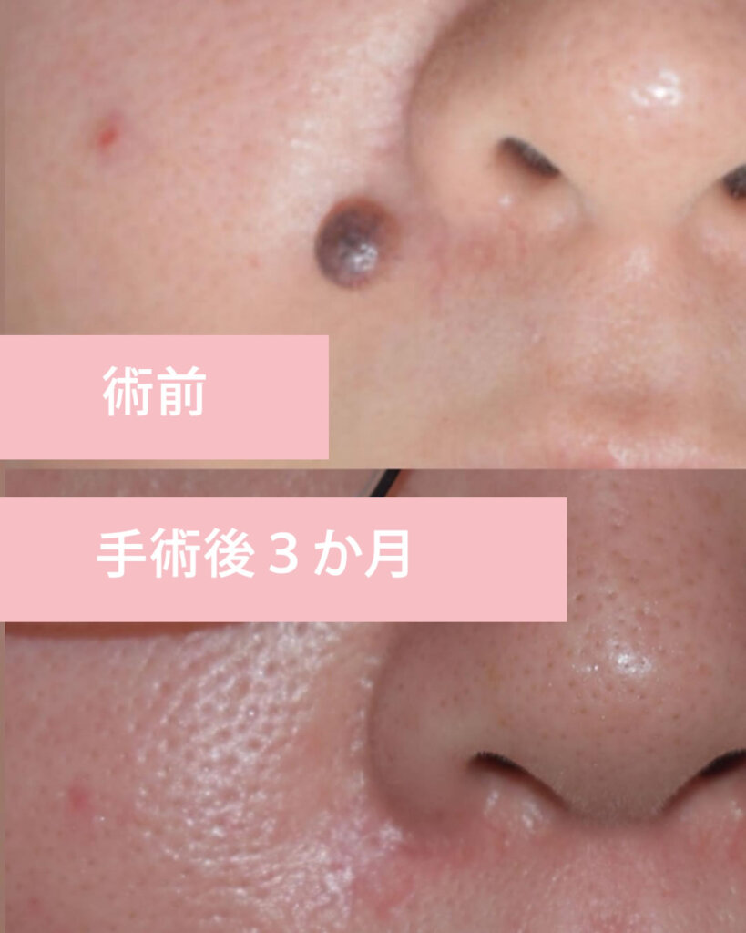 この症例では鼻の横のホクロを除去しました。術後3ヶ月の状態です。