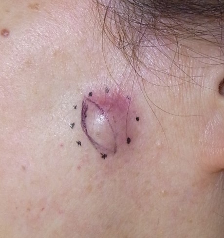 癒着した皮膚を含めて、ホクロと同様しわ線に沿って切除範囲をデザインします。