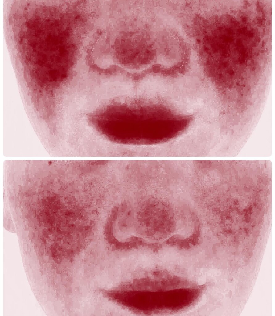 数回の治療は必要になりますが、少しずつ赤みの範囲が狭くなることで効果を実感される方が多いです。この症例写真は光治療を4回した症例写真です。