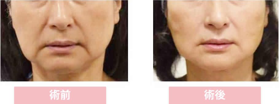 」、「皮膚の伸縮」などが考えられます。また、「痩せてしまう」、「ボリュームがある」といったようにたるみのタイプもさまざまです。この症例の場合、レスチレンという強度が硬いヒアルロン酸でリフトアップを行いました、術後はフェイスラインがすっきりしており、ほうれい線も目立たなくなっています。