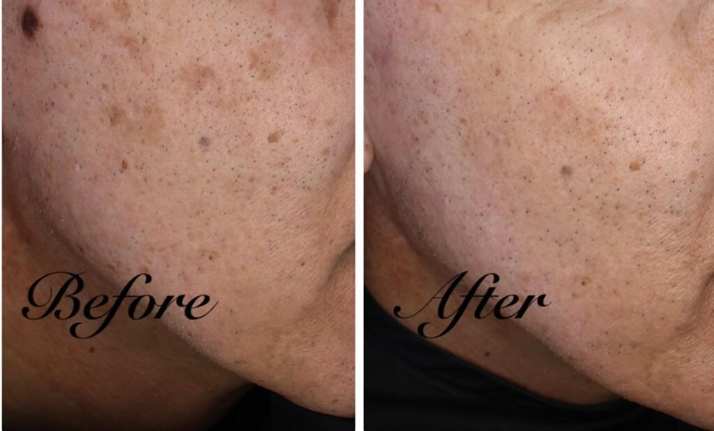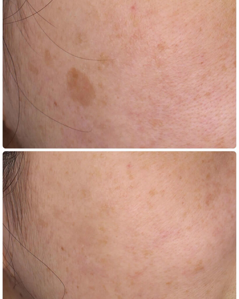 施術前の写真の左側の濃い色のシミは「脂漏性角化症」で「老人性イボ」とも呼ばれます。